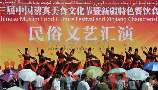 2013年8月28日,作为第三届中国——亚欧博览会组成部分的第三届中国清真美食文化节暨新疆特色餐饮食品博览会向市民开放,来自疆内外的120余家企业参展。这是美食节上的民俗文艺汇演。