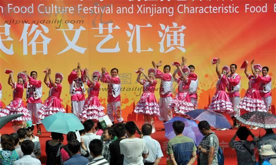 2013年8月28日,作为第三届中国——亚欧博览会组成部分的第三届中国清真美食文化节暨新疆特色餐饮食品博览会向市民开放,来自疆内外的120余家企业参展。这是美食节上的民俗文艺汇演。