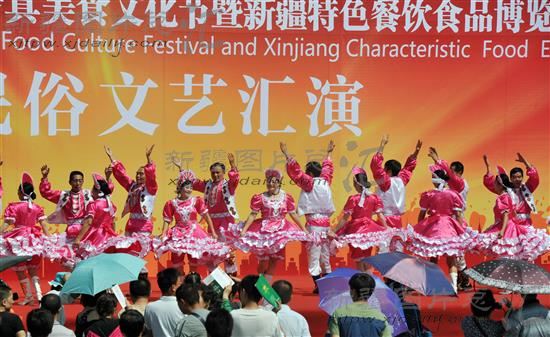 2013年8月28日,作为第三届中国——亚欧博览会组成部分的第三届中国清真美食文化节暨新疆特色餐饮食品博览会向市民开放,来自疆内外的120余家企业参展。这是美食节上的民俗文艺汇演。