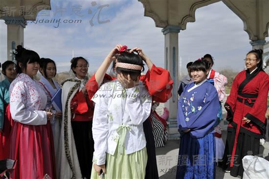 2013年3月25日,中华传统文化花朝节。乌鲁木齐市一些汉服爱好者着汉服,按照传统礼仪祭百花,踏青、射箭。