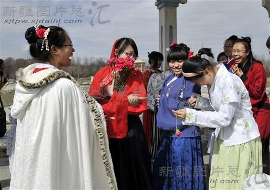 2013年3月25日,中华传统文化花朝节。乌鲁木齐市一些汉服爱好者着汉服,按照传统礼仪祭百花,踏青、射箭。