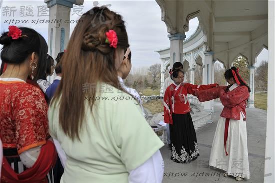 2013年3月25日,中华传统文化花朝节。乌鲁木齐市一些汉服爱好者着汉服,按照传统礼仪祭百花,踏青、射箭。