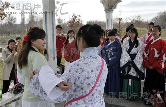 2013年3月25日,中华传统文化花朝节。乌鲁木齐市一些汉服爱好者着汉服,按照传统礼仪祭百花,踏青、射箭。