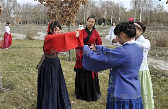 2013年3月25日,中华传统文化花朝节。乌鲁木齐市一些汉服爱好者着汉服,按照传统礼仪祭百花,踏青、射箭。