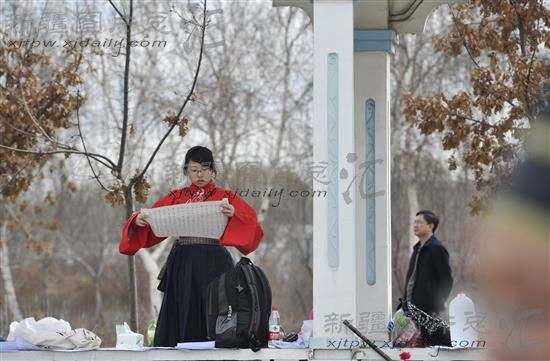 2013年3月25日,中华传统文化花朝节。乌鲁木齐市一些汉服爱好者着汉服,按照传统礼仪祭百花,踏青、射箭。