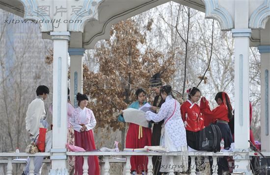 2013年3月25日,中华传统文化花朝节。乌鲁木齐市一些汉服爱好者着汉服,按照传统礼仪祭百花,踏青、射箭。