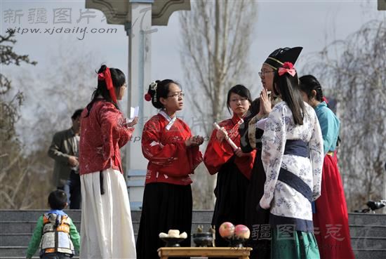 2013年3月25日,中华传统文化花朝节。乌鲁木齐市一些汉服爱好者着汉服,按照传统礼仪祭百花,踏青、射箭。