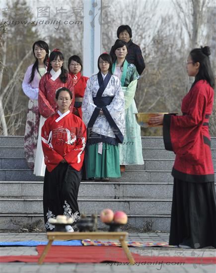 2013年3月25日,中华传统文化花朝节。乌鲁木齐市一些汉服爱好者着汉服,按照传统礼仪祭百花,踏青、射箭。