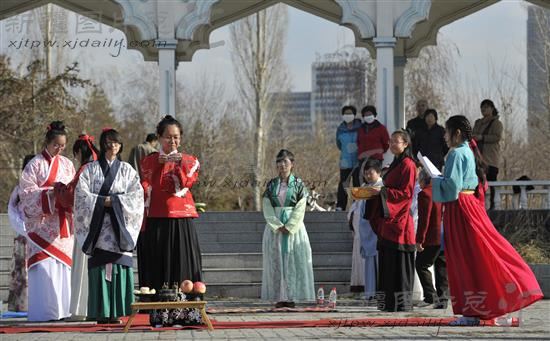 2013年3月25日,中华传统文化花朝节。乌鲁木齐市一些汉服爱好者着汉服,按照传统礼仪祭百花,踏青、射箭。