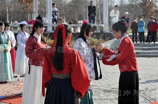 2013年3月25日,中华传统文化花朝节。乌鲁木齐市一些汉服爱好者着汉服,按照传统礼仪祭百花,踏青、射箭。
