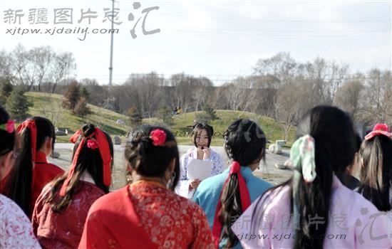 2013年3月25日,中华传统文化花朝节。乌鲁木齐市一些汉服爱好者着汉服,按照传统礼仪祭百花,踏青、射箭。