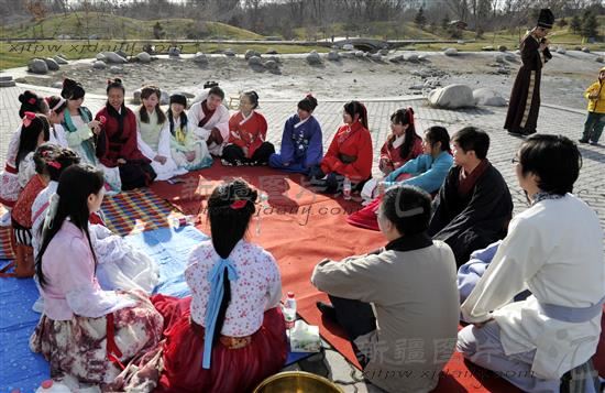 2013年3月25日,中华传统文化花朝节。乌鲁木齐市一些汉服爱好者着汉服,按照传统礼仪祭百花,踏青、射箭。