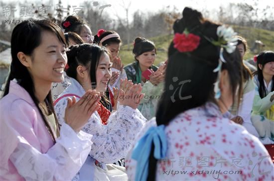 2013年3月25日,中华传统文化花朝节。乌鲁木齐市一些汉服爱好者着汉服,按照传统礼仪祭百花,踏青、射箭。