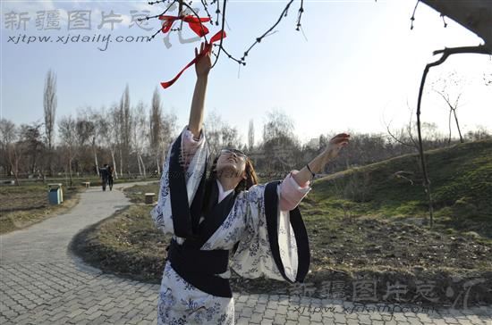 2013年3月25日,中华传统文化花朝节。乌鲁木齐市一些汉服爱好者着汉服,按照传统礼仪祭百花,踏青、射箭。