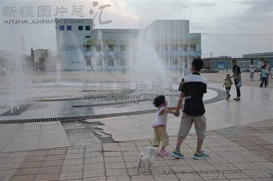 2014年7月6日,兵团第一师二团职工在团场小城镇广场欣赏音乐喷泉。