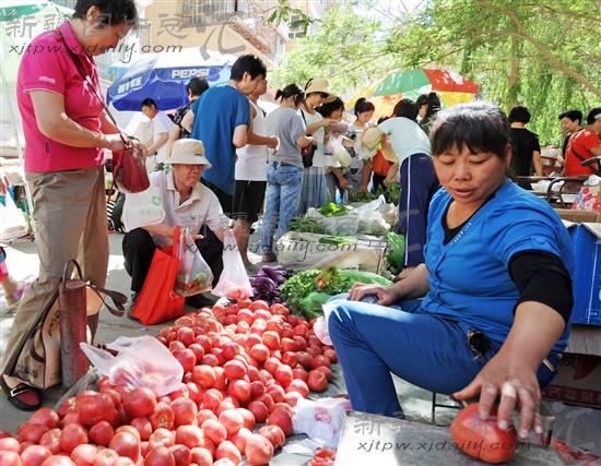 2014年7月6日,库尔勒市民在农贸市场购买蔬菜。