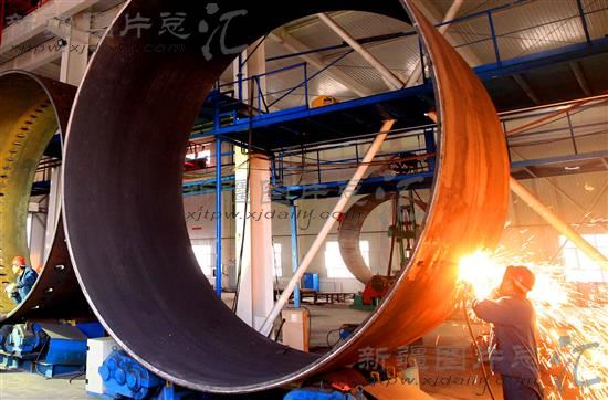 2012年3月15日,工人在焊接风机塔筒。近年来,哈密地区依托风电项目建设,先后引进了金风、海装、北车等多家风电装备制造企业,目前各风电装备制造企业陆续建成投产,预计今年风电整装机组产能达500台套,风电主机、叶片、塔筒将实现本地化生产。