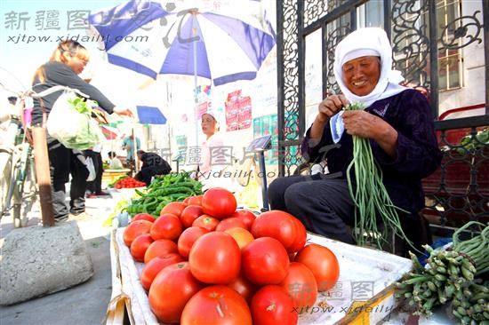 2014年7月6日,新疆生产建设兵团第五师89团农民马秀兰正在市场上出售自家庭院种植的蔬菜。