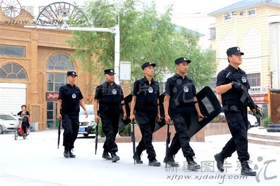 2014年7月5日,巡逻队员在新疆哈密市街头执勤。