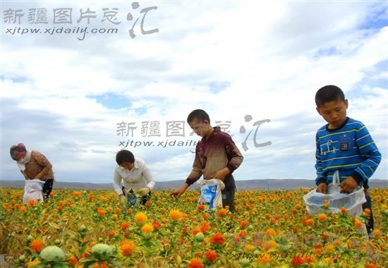 2014年7月4日,裕民县小学生在地里采摘红花。