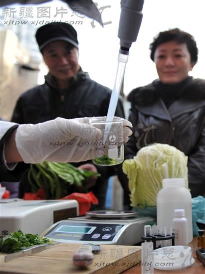 2012年3月14日,乌市农产品质量安全检测中心工作人员在为居民免费检测蔬菜农药残毒指标。当日,乌鲁木齐市农产品质量安全检测中心工作人员来到沙依巴克区扬子江社区蔬菜副食品直销点对销售的农产品进行了农药残毒抽检,并为顾客免费进行农药残毒检测服务。