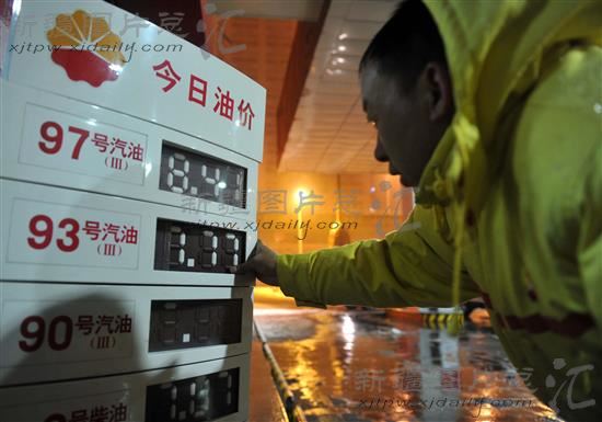 2012年3月19日23时55分,中石油乌鲁木齐市北京路加油站工作人员在调整油价提示牌。国家发展和改革委员会19日宣布,自20日零时起将汽、柴价格每吨均提高600元,相当于全国90号汽油和0号柴油每升平均分别提高0.44元和0.51元。