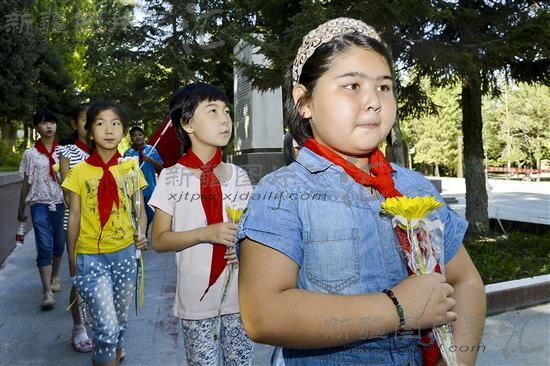 2014年7月7日,在乌鲁木齐市革命烈士陵园,小朋友在祭奠烈士,纪念“七七事变”77周年。