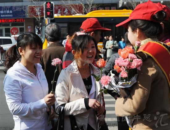 2012年3月28日,志愿者在为遵守交通规则的市民赠送鲜花。当日,乌鲁木齐市沙依巴克区举行“促现代文化 创文明城市”主题实践活动。该活动挑选了近千名志愿者,通过公益宣传、巡回演讲、走街串巷对不文明行为进行现场劝阻等方式进一步全市干部群众争做创建全国文明城市的宣传者和实践者,争做文明市民。