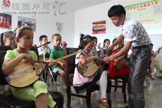 2014年7月8日,新疆阿勒泰市巴里巴盖乡文化站,来自市文化馆的老师正为农牧区孩子教授冬不拉弹奏技艺。