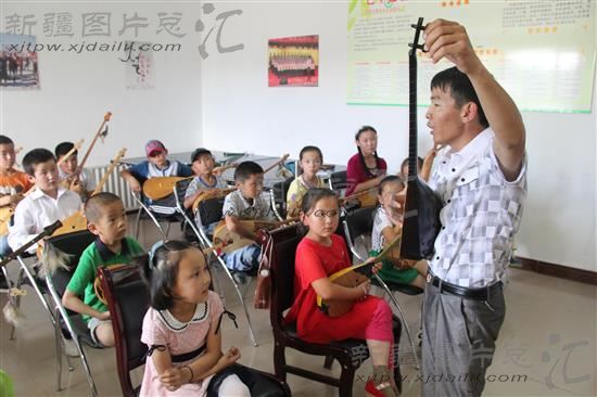 2014年7月8日,新疆阿勒泰市巴里巴盖乡文化站,来自市文化馆的老师正为农牧区孩子教授冬不拉弹奏技艺。