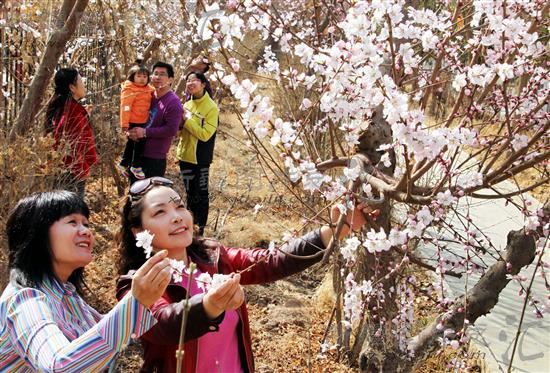 2012年3月18日,吐鲁番市民在街头欣赏盛开的桃花。连日来,吐鲁番市街头桃花盛开,吸引了众多市民和游客赏花。由于今年天气偏冷,桃树开花的时间比往年迟了10天左右。