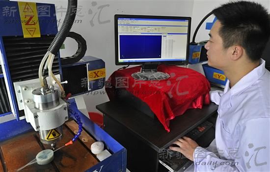 2014年6月30日,技术人员在用电脑进行玉石雕刻。
