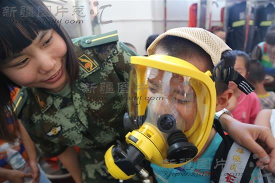 2014年7月7日,博尔塔拉蒙古自治州消防支队官兵给夏令营学生讲解消防呼吸器的使用方法。