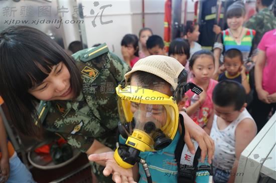 2014年7月7日,博尔塔拉蒙古自治州消防支队官兵给夏令营学生讲解消防呼吸器的使用方法。
