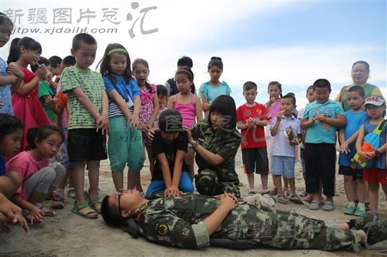2014年7月7日,博尔塔拉蒙古自治州消防支队官兵给夏令营学生讲解应急救护知识。