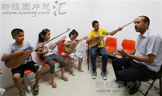 2014年7月9日,在且末县文化馆培训室内,参加培训的孩子正在练习弹奏民族乐器。