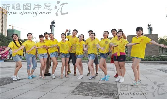 近日,库尔勒市22名青年志愿者自发组织在库尔勒市各景点跳网络红曲“小苹果”,并将其改编成文明城市礼仪手势向市民表演,展现库尔勒现代都市面貌和文明城市的风采。