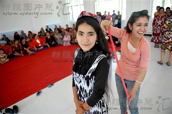2014年7月10日,新疆伊犁哈萨克自治州伊宁县莫洛托乎提于孜乡上武功村大学生村官热比艳·库尔班江(右)在给一维吾尔族妇女量头发。当天,上武功村的100多名各族妇女在村委会的文化活动室举行了长发比赛活动,激发了各族妇女热爱家乡、开创幸福美好新生活的热情。