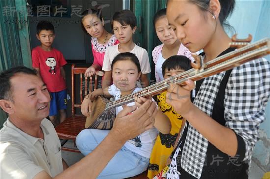 2014年7月10日,伊宁县莫洛托乎提于孜乡上武功村乡村文化带头人阿不都热西提·艾克拜尔在教小学生们弹维吾尔族乐器都塔尔。为了让小学生们度过一个快乐、安全的期期,阿不都热西提·艾克拜尔主动担任义务教员,系统地传授维吾尔族乐器知识,用传统文化濡染孩子们的心灵。