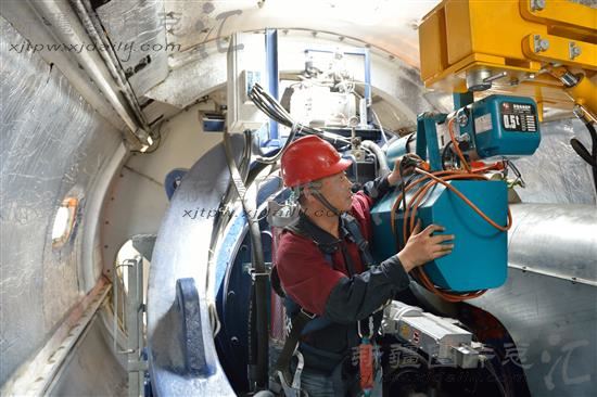 2014年7月11日,巴里坤三塘湖风电场工人在调试检测风机。