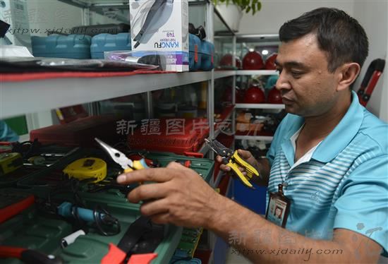 2014年7月13日,“暖心服务队”队员在整理维修工具。