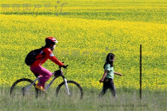 2014年7月13日,游客骑车在新疆哈密市白石头的油菜花地头游览。