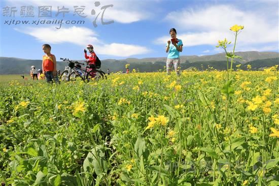 2014年7月13日,游客在新疆哈密市白石头的油菜花地头游览。