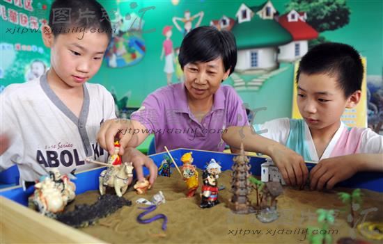 2014年7月15日,心理辅导老师利用沙盘游戏为小朋友进行心理辅导。
