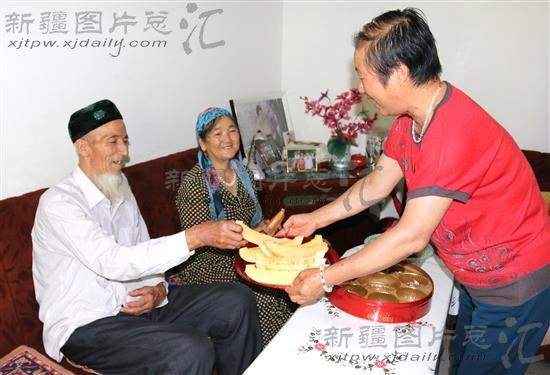 丽园街道社区居民赵桂英请结对的马木提·白克力夫妇在她家里品尝哈密瓜。