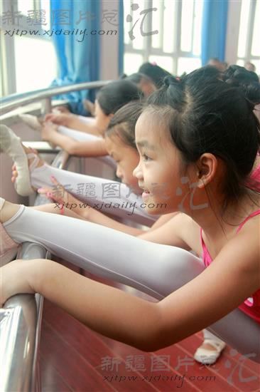 2014年7月16日,尉犁县青少年活动中心舞蹈练功房里,孩子们在练习舞蹈基本功。