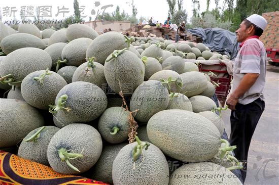 2014年7月18日,新疆哈密花园乡瓜农在等候销售哈密瓜。