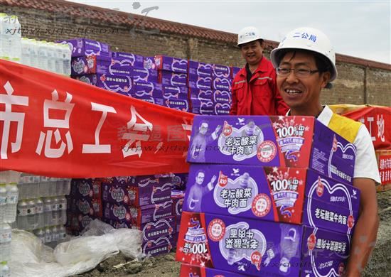 当日,乌鲁木齐市总工会开展“防暑降温送清凉”慰问活动。工作人员先后来到乌市西虹路至西山路高架桥二期工程一标段、乌拉泊公安卡点等地,为暑天工作在一线的建筑工人和公安特警送去价值20万元的矿泉水、方便面和电风扇等慰问品。