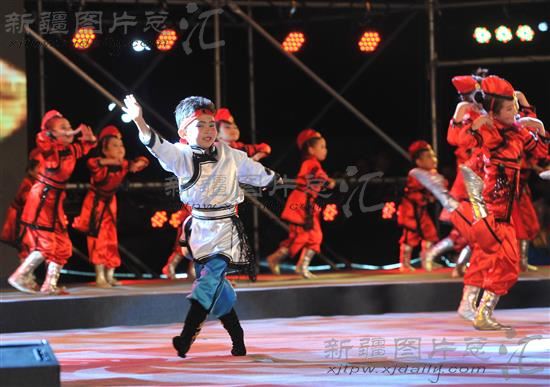 7月29日晚,在和布克赛尔蒙古自治县成立60周年文艺晚会上,小演员在表演蒙古族歌舞。