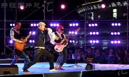 7月29日晚,在和布克赛尔蒙古自治县成立60周年文艺晚会上,来自内蒙古的额尔古纳乐队成员在为观众演唱歌曲《鸿雁》。